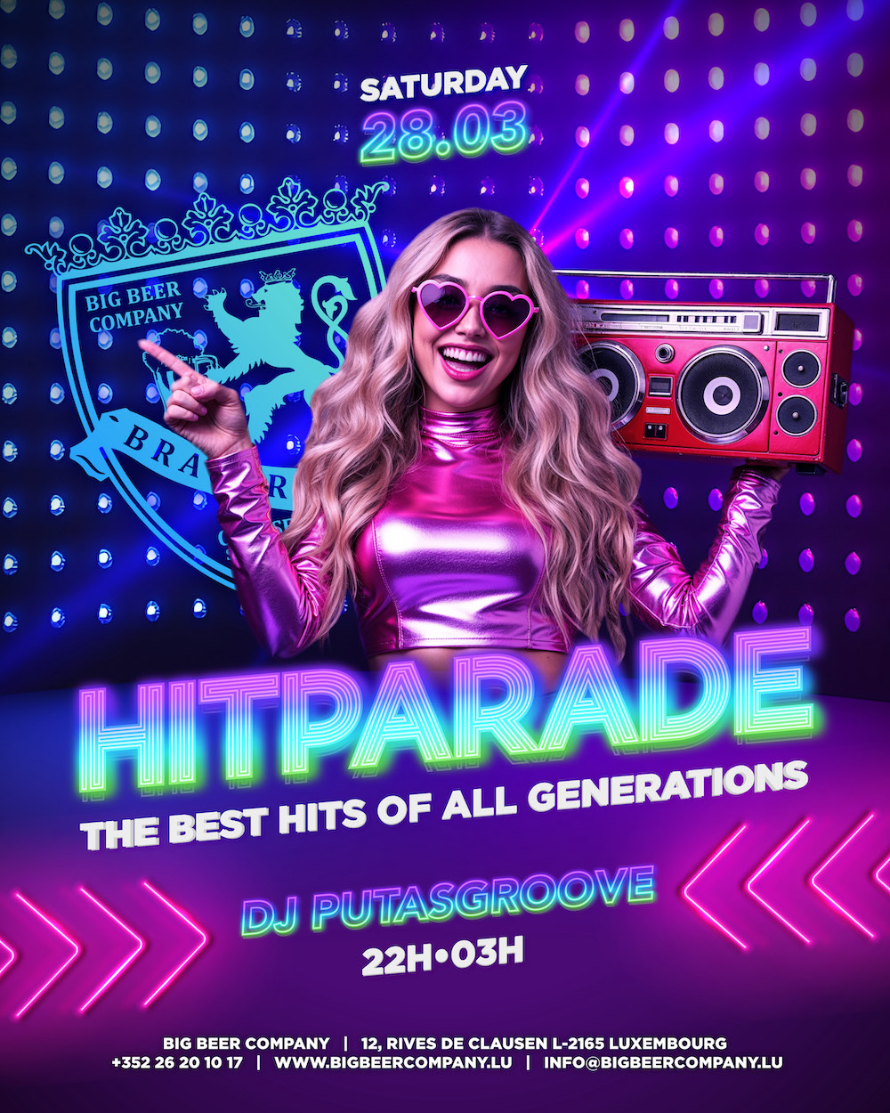• 2026-03-28 22:00:00 2026-03-28 23:00:00 Europe/Paris Big beer Hit parade BIG BEER HITPARADE De ABBA à Bruno Mars, de Michael Jackson à Justin Timberlake, les meilleurs hits de toutes les générations pour te faire danser toute la soirée 🎧 DJ Putasgroove aux platines ➡️ Ambiance garantie, tubes non-stop, dancefloor en feu. 12 Rives de Clausen, 2165 Luxembourg Brauerei - Big Beer Company
