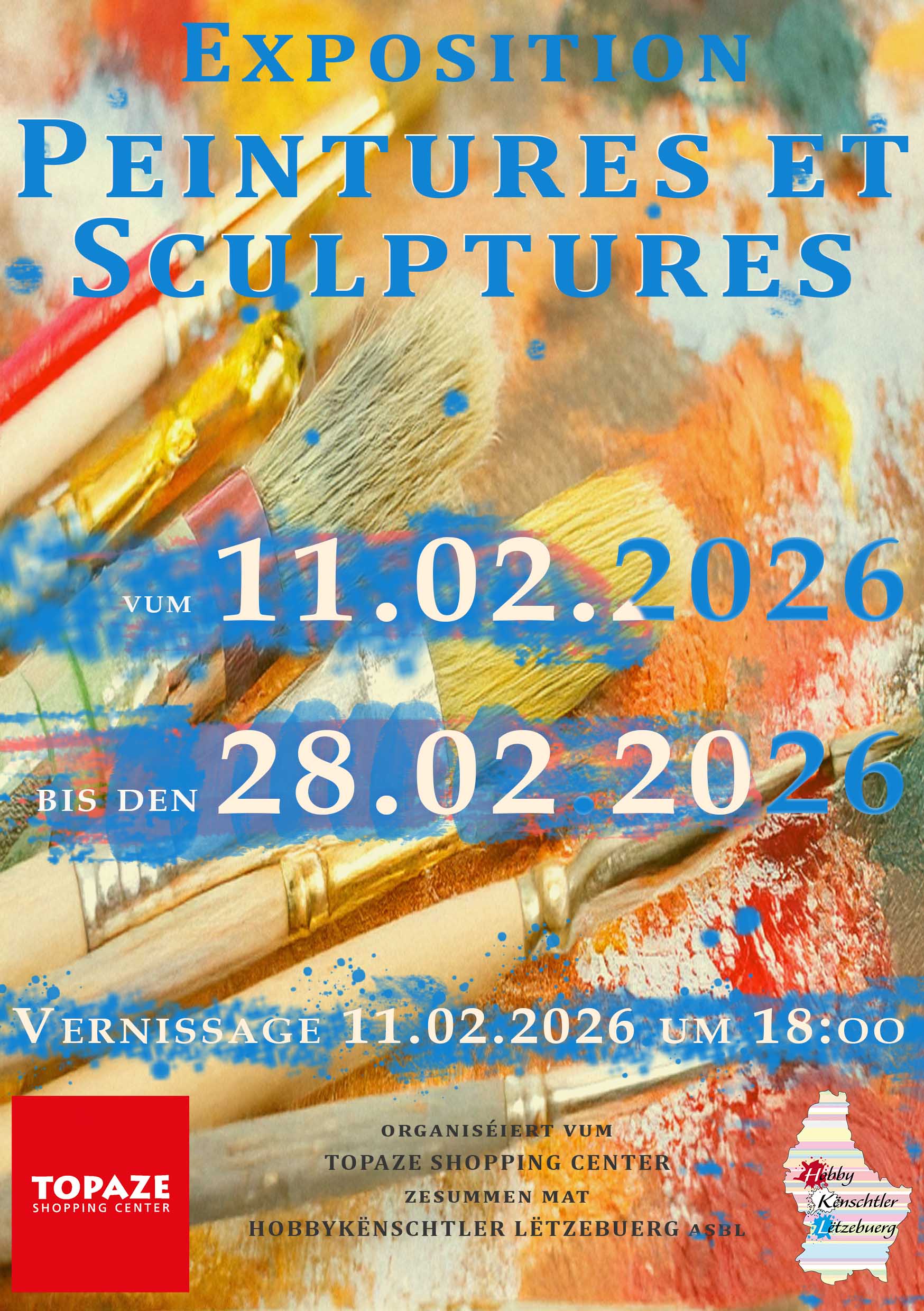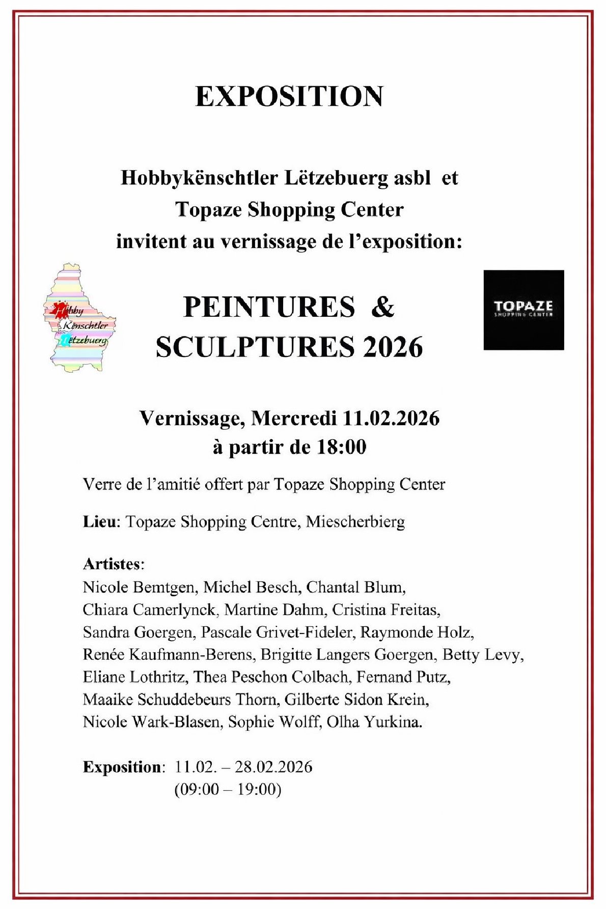 • 2026-02-11 18:00:00 2026-02-11 20:00:00 Europe/Paris Vernissage :Peintures & Sculptures Le 11 février à 18h00 aura lieu le vernissage de l'exposition d'art Peintures & Sculptures de l’association « Hobbykënschtler Lëtzebuerg asbl ». 20 artistes talentueux exposent leurs œuvres, mélangeant divers styles et inspirations. L'occasion parfaite pour rencontrer et discuter avec les artistes. L'exposition, organisée par le Topaze Shopping Center en collaboration avec „Hobbykënschtler Lëtzebuerg asbl“, est visible jusqu'au 28. février et peut être visitée pendant les heures d'ouverture du centre commercial. Topaze Shopping Center, Rue de Colmar-Berg, Mersch, Luxembourg Topaze Shoppig Center