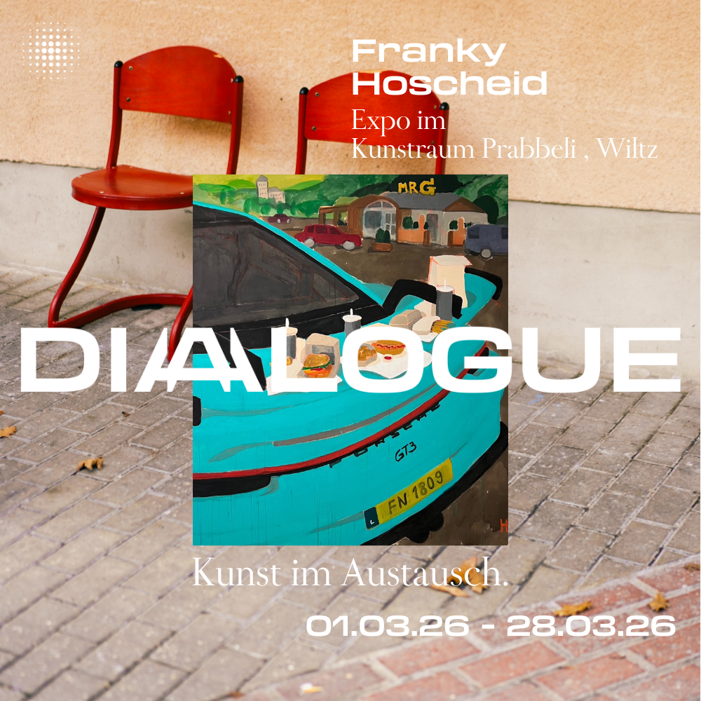 Franky Hoscheid, né en 1987, présente des scènes du quotidien sous forme de peintures expressives. Son style allant du naïf-expressionniste au modern-folklorique associe des champs clairs, des formes simples et des couleurs intenses. Les coups de pinceau gestuels génèrent une énergie spontanée et narrative. Le quotidien et l'esthétique sont associés de façon non conventionnelle : une voiture devient une table du petit-déjeuner, un salon une scène de présence silencieuse, un champ de tournesols un paysage tranquille. Ses œuvres transmettent sérénité, proximité et authenticité – une vision poétique du monde moderne à travers la couleur, la forme et l'émotion.
