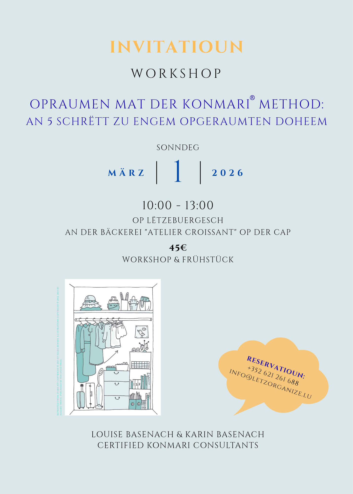 • 2026-03-01 10:00:00 2026-03-01 13:00:00 Europe/Paris Ranger avec la méthode KonMari® : 5 étapes pour une maison bien rangée Atelier : Vous rêvez d'une maison ordonnée, claire et sereine, où chaque chose a sa place ? La méthode de rangement de la Japonaise Marie Kondo est faite pour vous. Classée parmi les 100 personnes les plus influentes au monde par le magazine Time, elle a développé la méthode KonMari, divisée en cinq catégories. Lors de cet atelier, nous, consultants KonMari certifiés, vous montrerons comment appliquer cette méthode pour que vous puissiez ranger votre propre maison. Atelier Croissant, Route d'Arlon, Capellen Mamer, Luxembourg Atelier Croissant