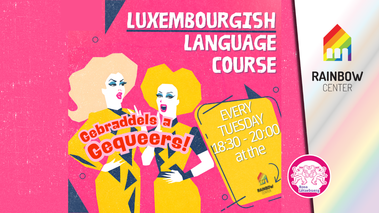 Nous sommes très heureux·ses d’accueillir notre cours de conversation en luxembourgeois chaque mardi soir au Rainbow Center ! Ce cours met l’accent sur la prise de parole et l’interaction, plutôt que sur les règles de grammaire, avec bien sûr quelques paillettes queer en bonus.