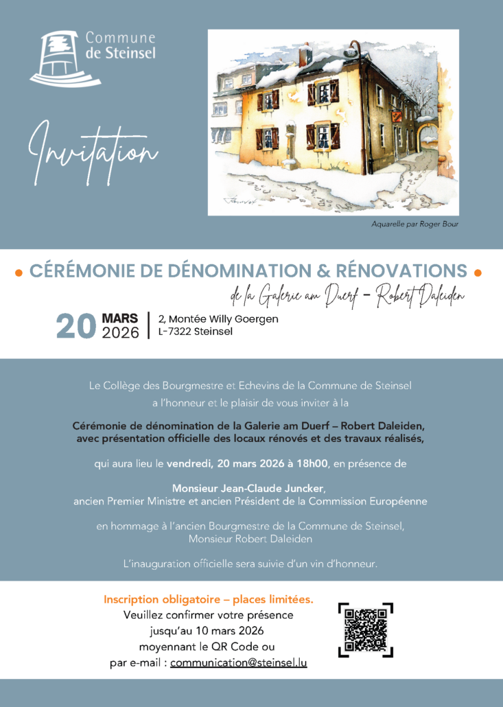 • 2026-03-20 2026-03-20 Europe/Paris Cérémonie de dénomination & rénovations de la Galerie am Duerf – Robert Daleiden Invitation à la cérémonie de dénomination et de rénovation de la Galerie am Duerf – Robert Daleiden. 2 Mnt Willy Goergen, 7322 Steinsel, Luxembourg Commune de Steinsel