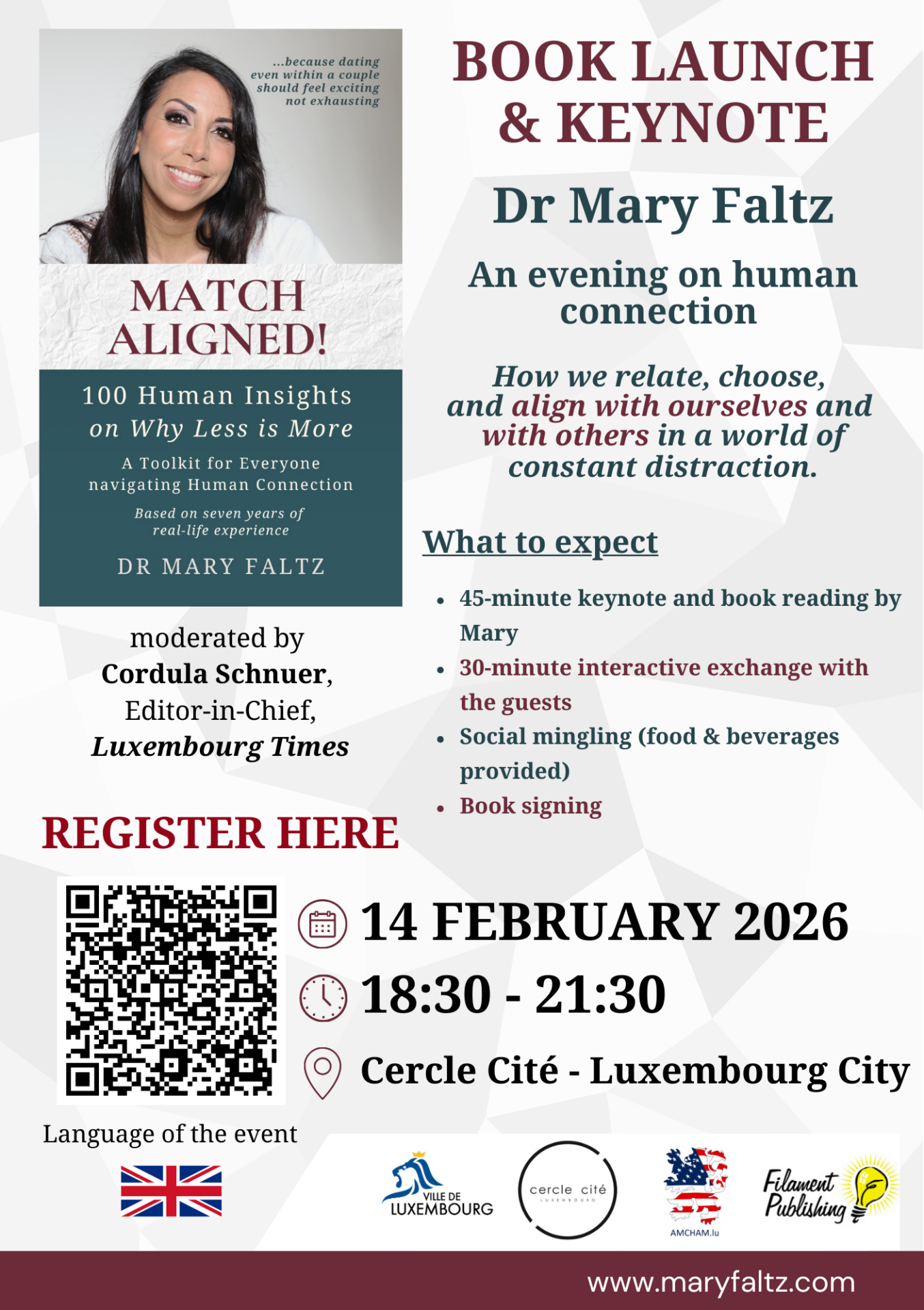 • 2026-02-14 18:30:00 2026-02-14 21:30:00 Europe/Paris Match aligned, une soirée sur la connexion humaine Nous sommes heureux de présenter Dr. Mary Faltz comme conférencière principale et le lancement de son livre "Match Aligned". La soirée sera centrée sur des thèmes actuels touchant aussi bien le domaine professionnel que personnel : l'alignement, la connexion humaine et la manière dont le désalignement se manifeste dans les relations, au travail et en matière de leadership personnel. La soirée comprendra une intervention de 45 minutes suivie d’un échange modéré avec le public. Il ne s'agit pas d'un atelier ou d'une formation, mais d'un espace de réflexion partagée, basé sur l'expérience vécue, la recherche et des années d'observation du comportement humain dans des environnements exigeants. 2 Rue Genistre, 1368 Ville-Haute Luxembourg