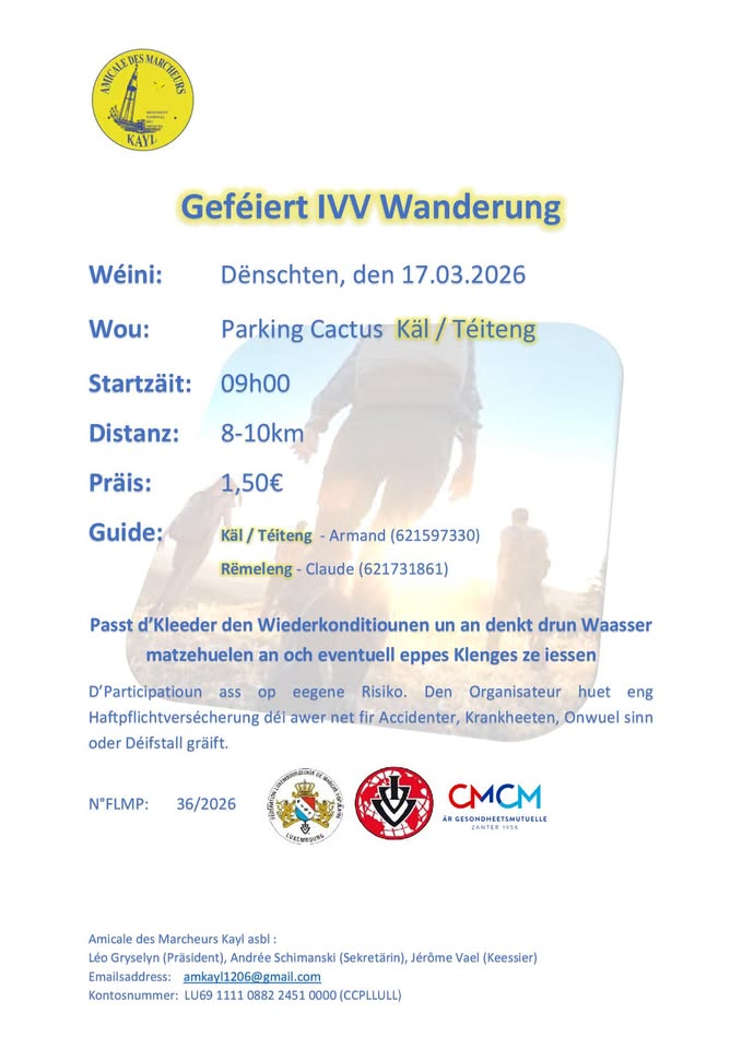 Participez à une randonnée guidée organisée par l'Amicale des Marcheurs Kayl Asbl sur une distance de 8 à 10 km. Pensez à adapter vos vêtements aux conditions météorologiques et à emporter de l'eau ainsi qu'une petite collation.