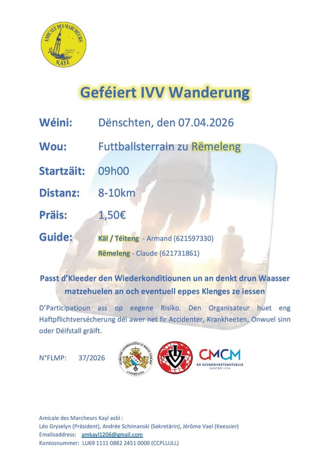 Participez à une randonnée encadrée à Rëmeleng, organisée par l'Amicale des Marcheurs Kayl Asbl. Adaptez votre tenue aux conditions météorologiques et pensez à apporter de l'eau et éventuellement un petit encas.