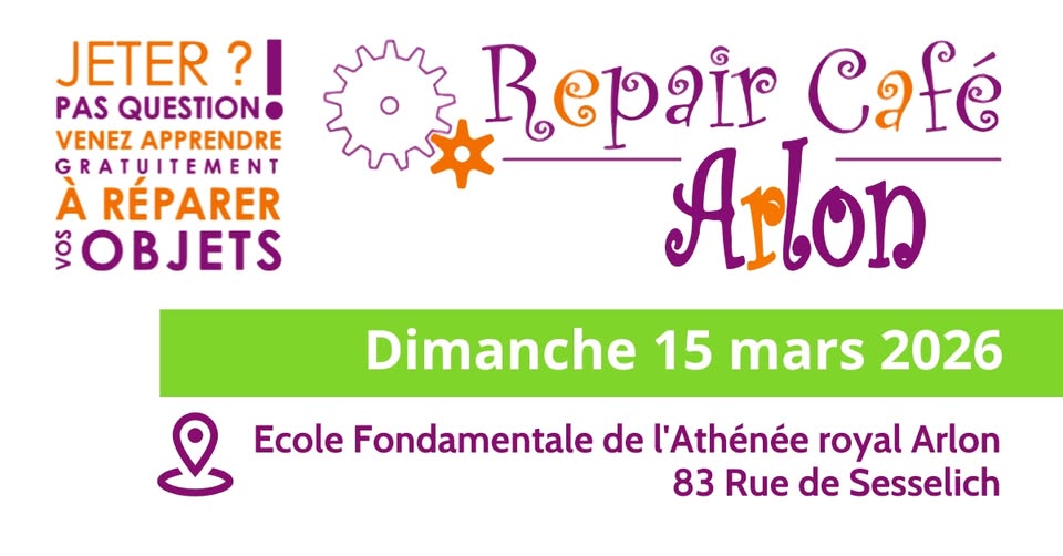 • 2026-03-15 09:00:00 2026-03-15 10:00:00 Europe/Paris Repair Café de mars à Arlon Les Repair Cafés sont des ateliers organisés pour apprendre à réparer ensemble nos objets défectueux au lieu de les jeter. Ils sont aussi l'occasion de se rencontrer et partager savoirs et expériences. L’objectif est de co-réparer entre citoyens et d'adopter de nouvelles habitudes pour lutter contre le gaspillage. Apportez vos objets usagés ou abîmés et les réparateurs bénévoles feront de leur mieux pour leur offrir une seconde vie. Rue de Sesselich 83, 6700 Arlon, Belgium Maison de la Laïcité Victor Tedesco