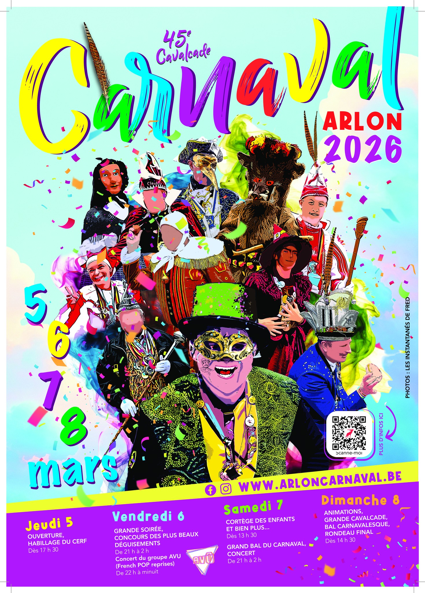 Les festivités commencent jeudi par l'habillage du Cerf, suivies d'un bal en soirée et d'un concours du plus beau costume le vendredi sur la Place Léopold. Samedi, le cortège des enfants et la joyeuse entrée de la Cour auront lieu dès 13h30 devant l'Hôtel de Ville. La grande Cavalcade se déroulera dimanche dans tout le centre-ville, à partir de 14h30 depuis l'Avenue du 10è de Ligne.