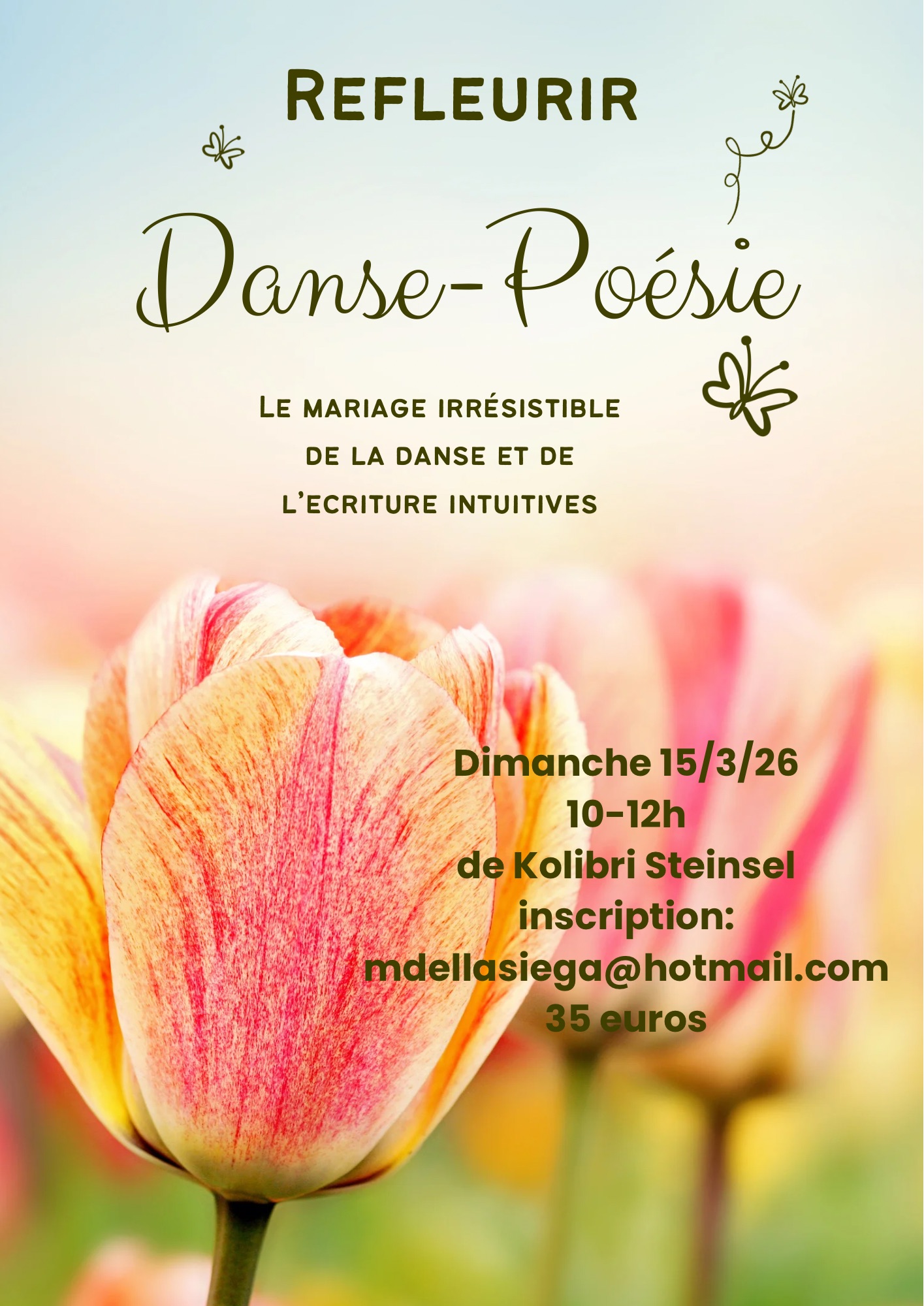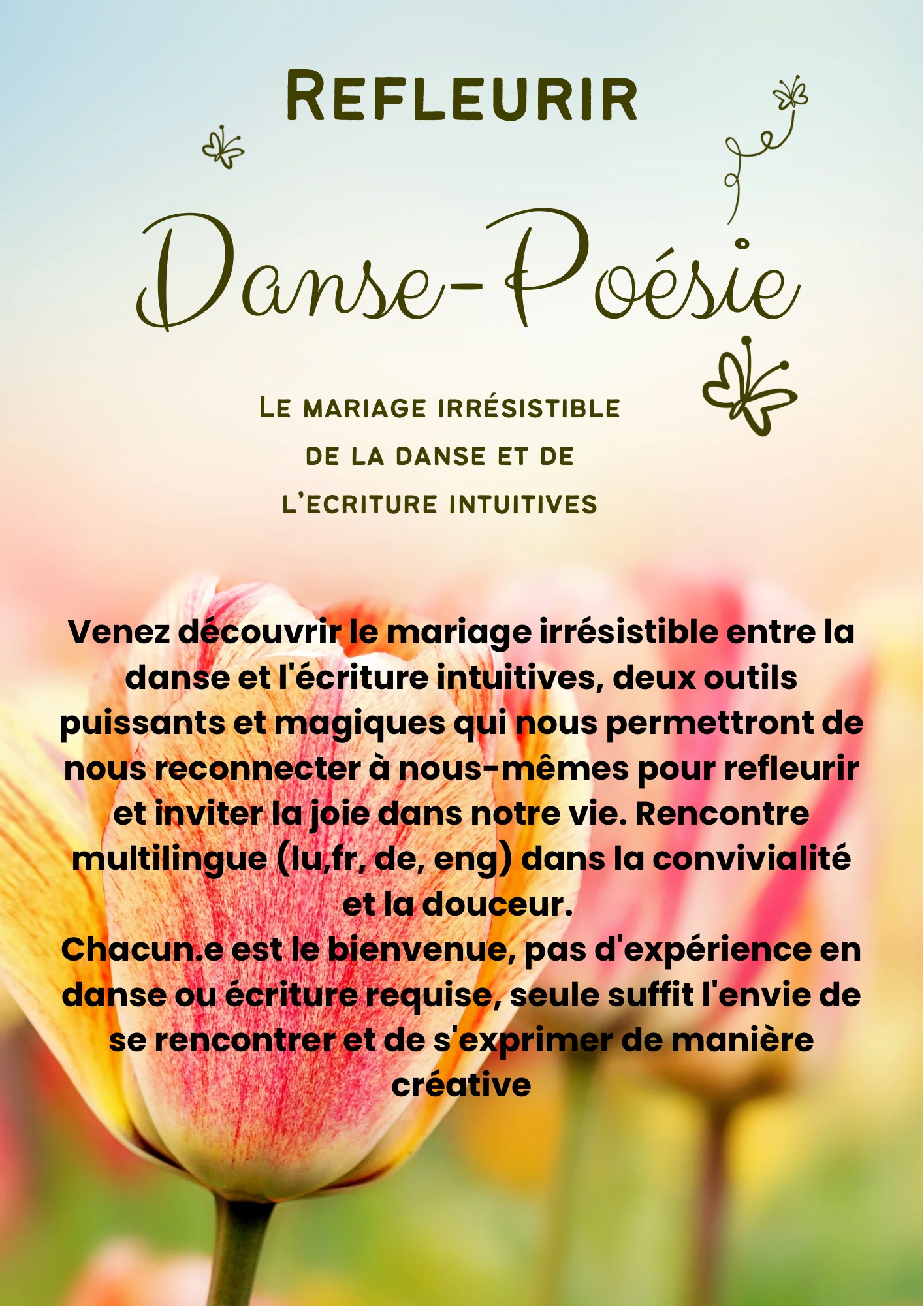 Venez découvrir le mariage irrésistible entre la danse et l'écriture intuitives, deux outils puissants et magiques qui nous permettront de nous reconnecter à nous-mêmes pour refleurir et inviter la joie dans notre vie.