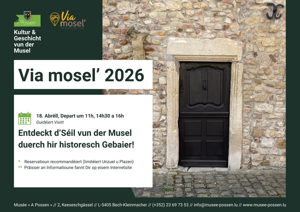 • 2026-04-18 10:00:00 2026-04-18 10:45:00 Europe/Paris Découvrez l’âme de la Moselle à travers ses bâtisses d’antan ! Dans le cadre des Portes Ouvertes Via Mosel, voyagez dans le temps et explorez l’architecture traditionnelle de l’habitat rural mosellan au Musée « A Possen ». Vous participerez à une visite guidée conviviale pour découvrir différentes maisons, leurs secrets de construction et l’évolution de l’architecture au fil des siècles. Du Possenhaus au Wëtzelschapp, en passant par l’Uedemshaus, chaque lieu dévoile une part précieuse du patrimoine régional. Laissez-vous transporter jusqu’aux moindres recoins du musée dans une expérience unique. 2, Keeseschgaessel, 5404 Bech-Kleinmacher, Luxembourg Musée A Possen