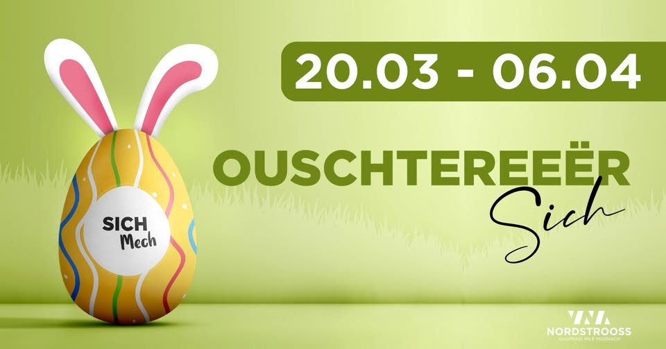 Le lapin de Pâques a caché 4 gros œufs colorés au Nordstrooss. Ceux qui trouvent les quatre œufs auront la chance de gagner l'un des 3 prix. Les œufs de Pâques peuvent aussi bien se trouver dans le bloc A, B ou C.