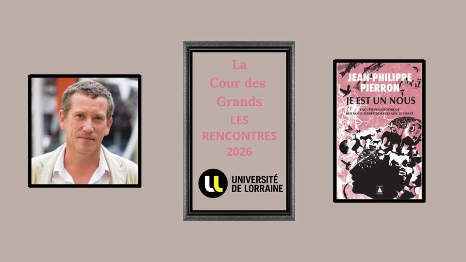 • 2026-03-31 17:30:00 2026-03-31 18:30:00 Europe/Paris Rencontre avec Jean-Philippe Pierron pour son essai Je est un nous paru aux éditions Actes Sud Dans "Je est un nous", Jean-Philippe Pierron propose une enquête auprès de philosophes et de penseurs de l'écologie pour comprendre notre regard sur le monde qui nous entoure. Dire "je" c'est exprimer combien nous sommes reliés à la nature par d'innombrables capillarités secrètes. Souvent la rencontre d'un animal ou d'un paysage est le catalyseur d'un engagement écologiste, comme si cette brèche poétique et sensible s'était ouverte, permettant une nouvelle manière de se penser, d'agir et de sentir. Cet ouvrage nous invite donc tous à envisager la dimension écobiographique de notre vie, et ainsi ouvrir la voie à des relations plus équilibrées avec le vivant. Jean-Philippe Pierron est philosophe et enseigne à l'Université de Bourgogne. Ses travaux portent sur une philosophie du soin et sur le rôle de l'imagination dans l'action. Il en explore la fécondité poétique dans les champs du soin médical, des réalités familiales ou du travail et de l'écologie. Il est également l'auteur de "L'insurrection des sens" paru chez Actes Sud. 12 rue Taison, 57000 Metz, France Librairie La Cour des grands