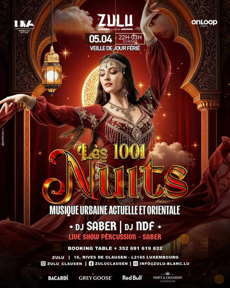Préparez-vous : notre soirée Les 1001 nuits débarque avec un mix explosif de raï moderne, urban vibes, chaâbi, gnawa, kabyle, ainsi que de sons tunisiens et marocains spécialement remixés par nos DJs.