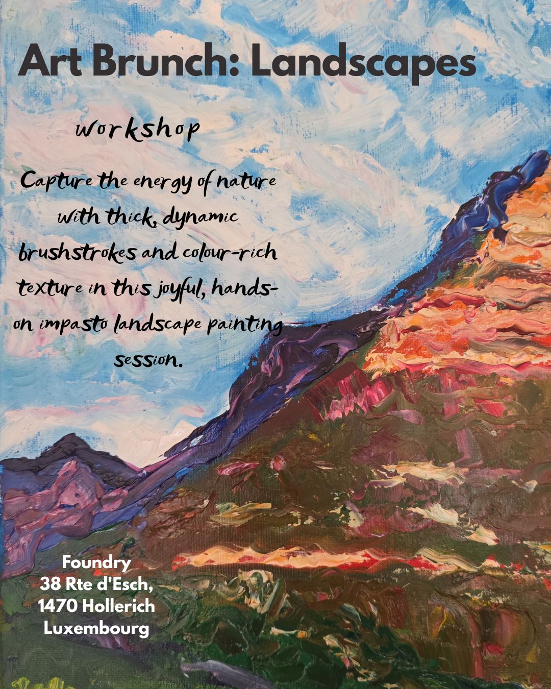 Capturez la beauté des lieux que vous aimez lors de cet atelier de peinture convivial, animé par l'artiste Alvira Ferreira, le samedi matin. Au cours de ce brunch artistique consacré au paysage, vous créerez votre propre peinture acrylique inspirée par la nature : soit à partir d'une photo personnelle que vous apporterez, soit à partir d'une sélection de paysages proposés sur place.