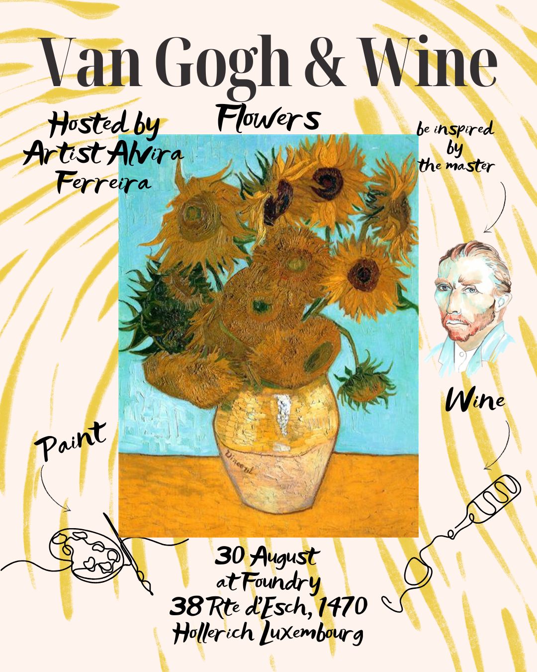 Rejoignez-moi, Alvira Ferreira, pour une soirée créative et détendue où vous pourrez choisir votre inspiration artistique. Dans cet atelier de peinture accessible aux débutants, vous sélectionnerez une œuvre parmi une collection de six styles emblématiques – inspirés par Monet, Van Gogh, Degas, Matisse ou Picasso – et je vous guiderai pas à pas dans la création de votre propre version à la peinture acrylique.