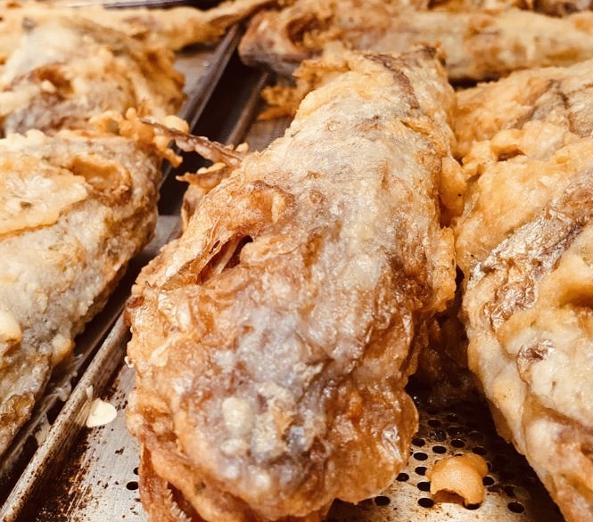 Bakfësch accompagné de pommes de terre, sauce rémoulade et citron.