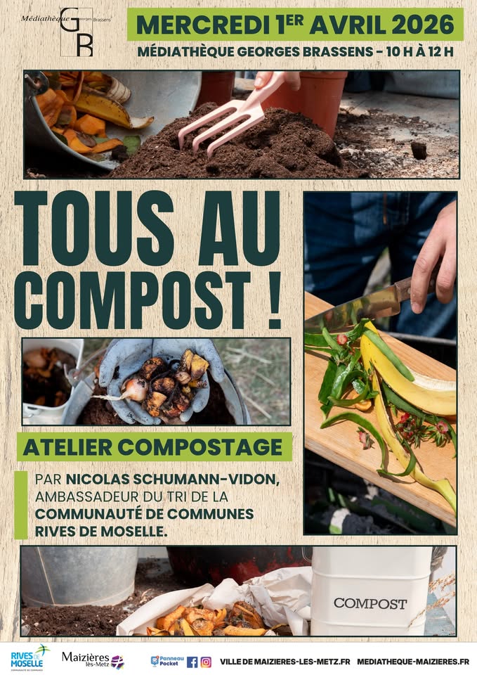 • 2026-04-01 09:00:00 2026-04-01 11:00:00 Europe/Paris Rencontre "Tous au compost !" Une rencontre autour du compostage, animée par Rives de Moselle à l’occasion de l’opération nationale "Tous au Compost !". Animation pédagogique autour du compost et découverte des différentes méthodes de compostage. Médiathèque Georges Brassens Médiathèque Georges Brassens