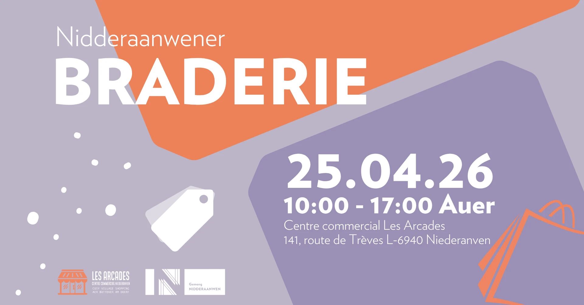 • 2026-04-25 10:00:00 2026-04-25 17:00:00 Europe/Paris Nidderaanwener Braderie En collaboration avec les commerçants, les associations et les clubs de la commune, le Collège échevinal vous invite chaleureusement à la braderie de Niederanven. Outre l’ouverture officielle, la braderie vous réserve de belles affaires et une animation conviviale. Côté gourmandise, restauration et boissons seront bien évidemment aussi de la partie. Rendez-vous le samedi 25 avril à partir de 10h00 pour partager avec nous une agréable journée placée sous le signe de la bonne humeur, pour toute la famille ! Ouverture officielle à 11h00 ! 141 Route de Treves, 6940 Senningen Niederanven, Luxembourg Commune de Niederanven / Gemeng Nidderaanwen