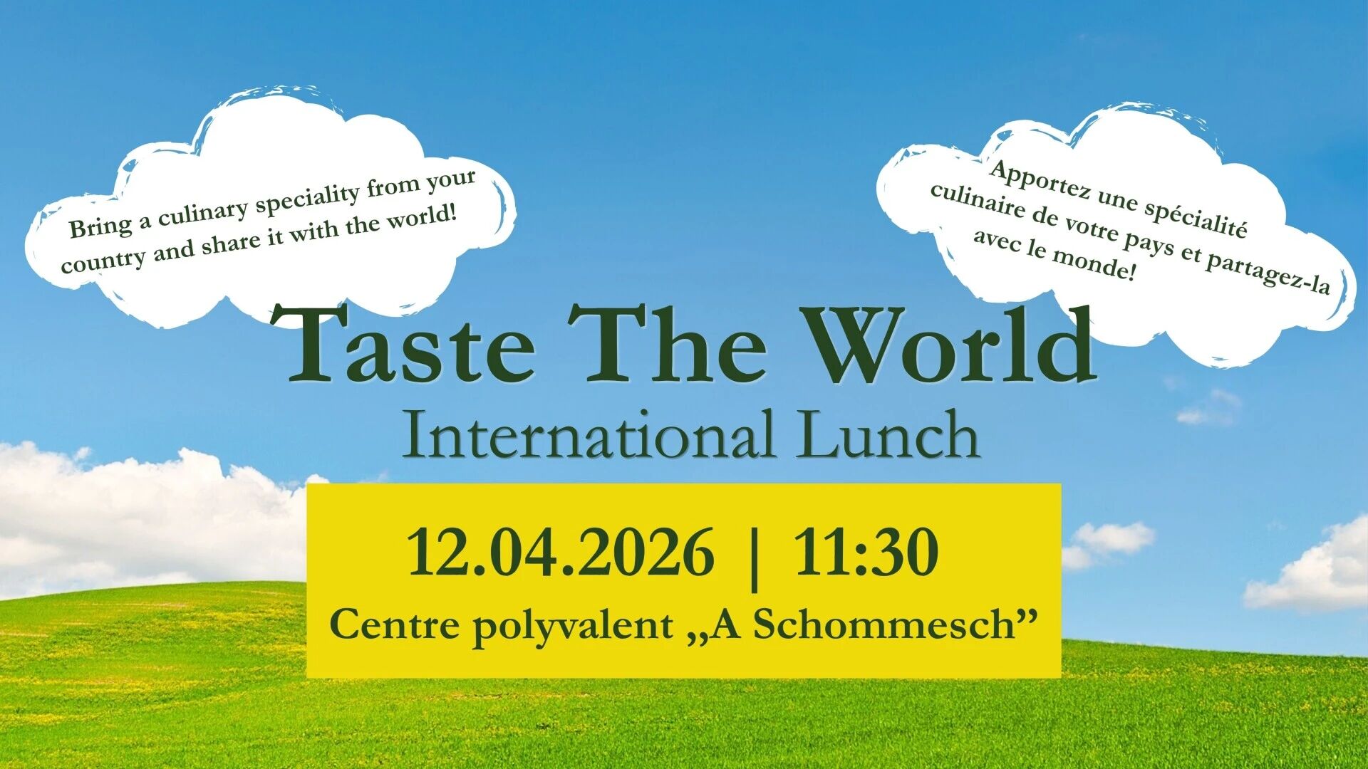 La Commission du vivre-ensemble interculturel a le plaisir d'inviter tout le monde à son "Taste The World – International Lunch". Apportez une spécialité culinaire de votre pays ou région afin de déguster, partager et découvrir d'autres cultures dans une ambiance conviviale.