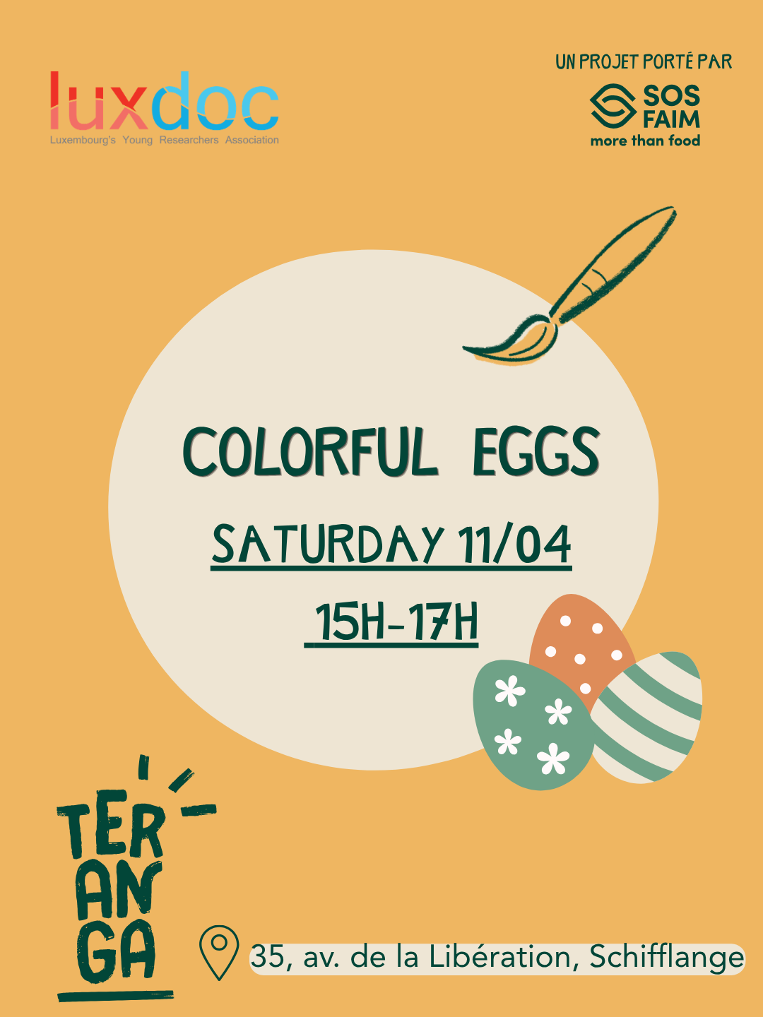 • 2026-04-11 15:00:00 2026-04-11 17:00:00 Europe/Paris Colorful Eggs Envie d'un moment créatif ? Le samedi 11 avril, rejoignez-nous pour un après-midi artistique où vous décorerez des œufs à l'aide de techniques simples, ludiques… et 100 % naturelles. Saviez-vous, par exemple, que les pelures d'oignon peuvent donner une couleur étonnante ? Nous allons l'essayer ensemble dans une ambiance chaleureuse et détendue ! Idéal pour se détendre et faire de nouvelles rencontres. Cet atelier est organisé en collaboration avec LuxDoc, une association pour les jeunes chercheurs et les personnes intéressées par les sciences. Venez ajouter une touche de couleur à votre printemps ! TERANGA - Maison de la transition alimentaire, Avenue de la Libération, Schifflange, Luxembourg TERANGA - Maison de la transition alimentaire