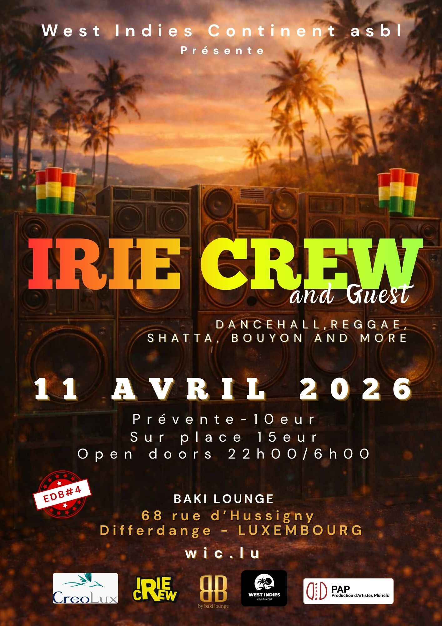 Samedi 11 avril 2026, plonge dans une nuit aux couleurs des Caraïbes : Dancehall, Reggae, Shatta, Bouyon et plus encore, dans une ambiance authentique portée par IRIE CREW & Guest.