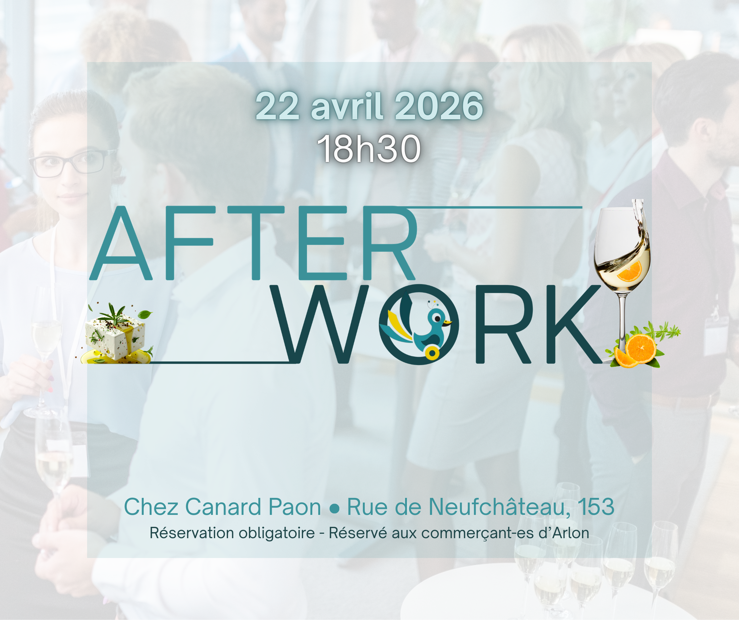 • 2026-04-22 2026-04-22 Europe/Paris After-Work Commerçants arlonais L'ACIA organise une soirée After-Work pour ses membres chez Canard Paon. Un moment convivial et de partage pour consolider le maillage entre nouveaux et anciens commerçants. Rue Paul Reuter 13, 6700 Arlon, Belgique Association Commerciale et Industrielle d’Arlon (ACIA)