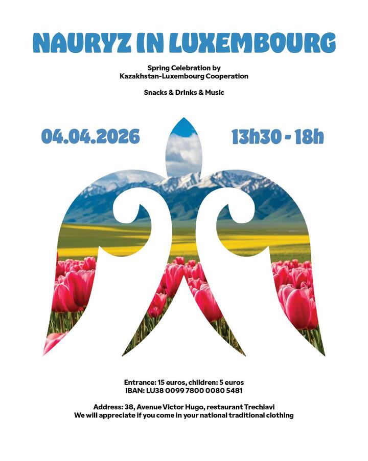 • 2026-04-04 13:30:00 2026-04-04 18:00:00 Europe/Paris Bienvenue au printemps ! Fête de Nauryz : le printemps est dans l'air ! Accueillons-le ensemble et célébrons Nauryz avec la Coopération Kazakhstan-Luxembourg asbl et tous nos amis. N'hésitez pas à apporter des plats ou des boissons traditionnels à partager. Les tenues traditionnelles sont les bienvenues. Venez avec vos amis, votre famille et votre bonne humeur ! 38 Av. Victor Hugo, 1750 Limpertsberg Luxembourg Ville de Luxembourg