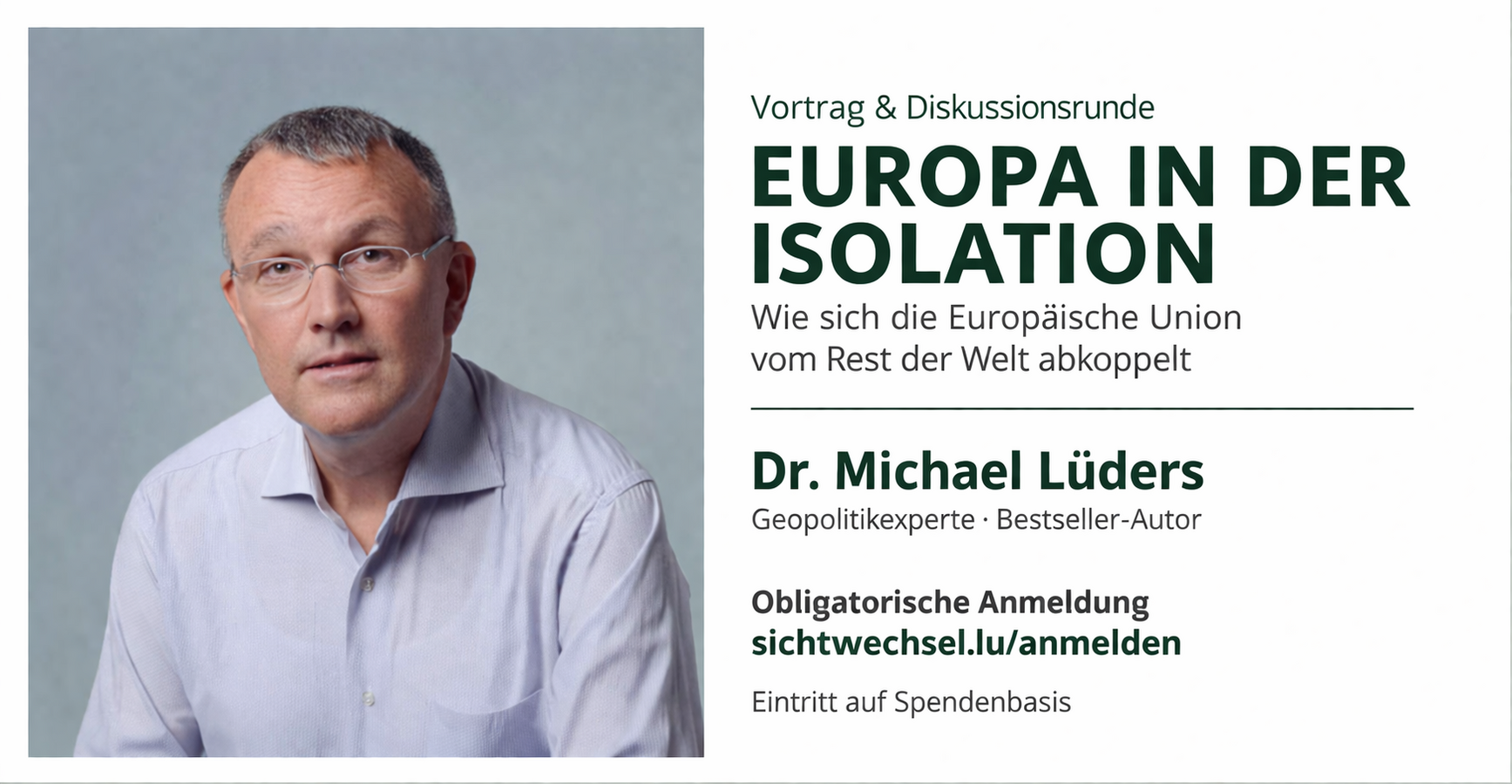 Pourquoi l’Union européenne se coupe du reste du monde ? Les évolutions géopolitiques récentes posent de nouvelles questions à l’Europe. Sanctions, incertitudes économiques et tensions internationales redessinent progressivement l’ordre mondial. Que signifie cette situation pour l’avenir de l’Europe ? Comment rester capable d’agir dans un monde en mutation ? Cette conférence s’adresse à toutes celles et ceux qui souhaitent mieux comprendre les enjeux actuels – au-delà des idées reçues. Le renommé Dr Michael Lüders, expert en géopolitique et auteur à succès, propose des éléments d’analyse et ouvre la réflexion sur les perspectives possibles.