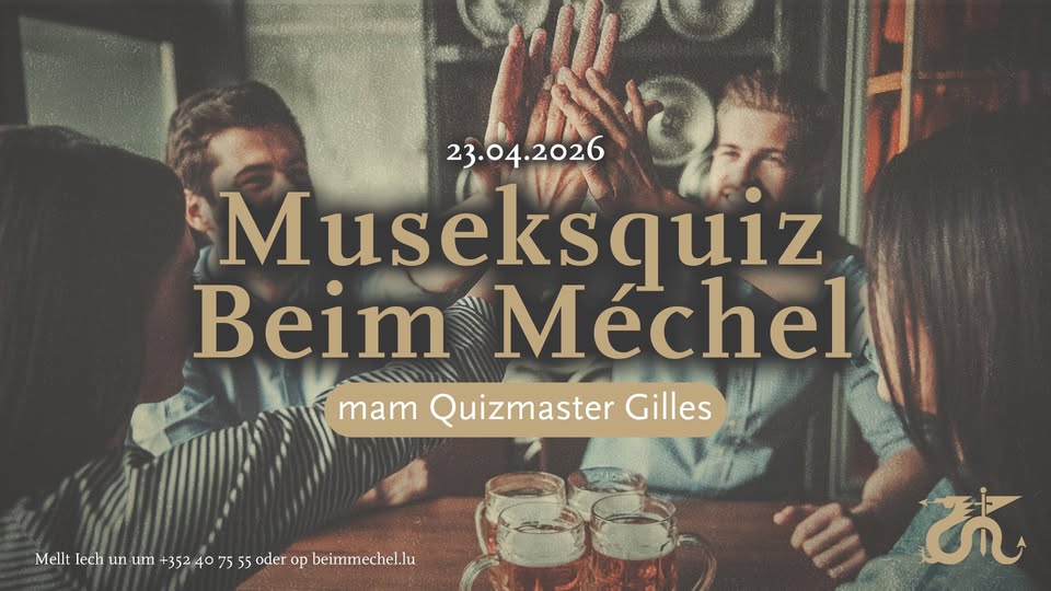 Participez à une soirée quiz chez Beim Méchel ! Inscrivez votre équipe et testez vos connaissances musicales avec le quizmaster Gilles Rauen. Un prix sympa attend les gagnants.
