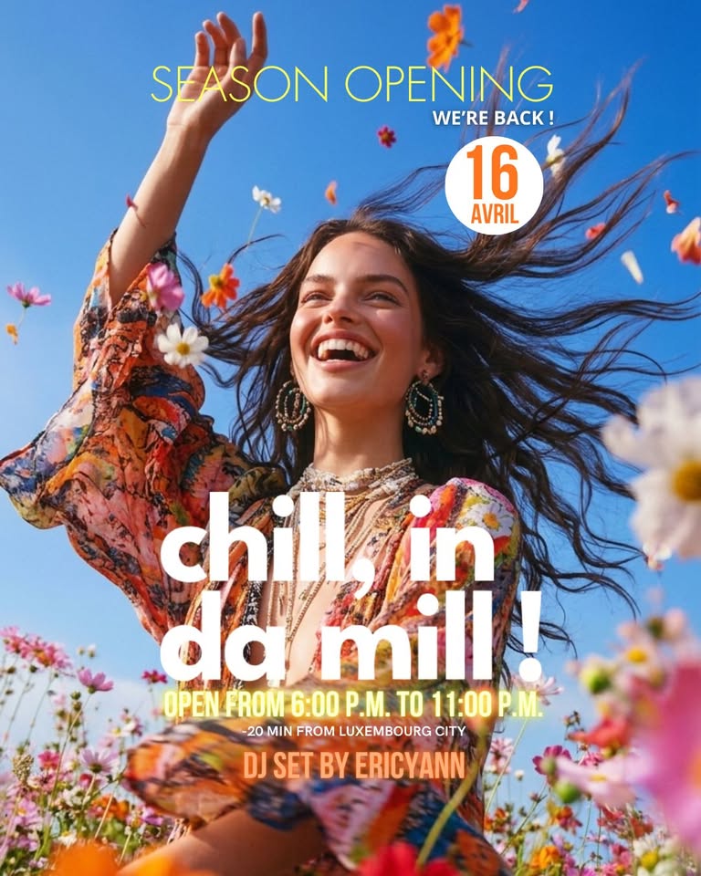 • 2026-04-16 16:00:00 2026-04-16 20:30:00 Europe/Paris After Work Chill in da Mill – Ouverture de saison Navettes entre Aspelt et Mondorf. 1 Heinrichsmillen, Altwies Mondorf-les-Bains, Luxembourg Le Moulin d'Altwies