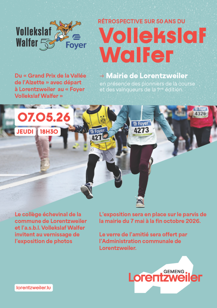 • 2026-05-07 2026-05-07 Europe/Paris Rétrospective sur 50 ans du Vollekslaf Walfer Exposition retraçant les 50 ans du Vollekslaf Walfer. Lorentzweiler, Luxembourg Commune de Steinsel