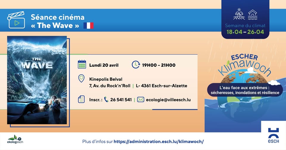 • 2026-04-20 18:00:00 2026-04-20 19:00:00 Europe/Paris Séance cinéma "The Wave" Venez découvrir un film catastrophe spectaculaire : après plusieurs années à surveiller la montagne qui surplombe le fjord où il habite, Kristian, scientifique, s’apprête à quitter la région avec sa famille. Quand un pan de montagne se détache et provoque un tsunami, il doit retrouver les membres de sa famille et échapper à la vague dévastatrice. Le compte à rebours est lancé... Cette projection a lieu dans le cadre de « Escher Klimawoch », une semaine d’actions et d’événements consacrés au climat et à la durabilité. avenue du Rock'n'Roll 7 Esch-sur-Alzette, Luxembourg EkologEsch