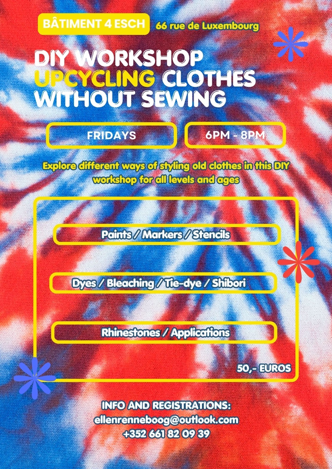 • 2026-07-10 18:00:00 2026-07-10 20:00:00 Europe/Paris Atelier DIY : recycler ses vêtements sans couture Atelier multilingue pour tous niveaux et tous âges. Explorer: peintures/marqueurs/pochoirs teintures/décoloration/teinture tie-dye/shibori rhines/applications Bâtiment 4 - Tiers lieu culturel, Rue de Luxembourg, Esch-sur-Alzette, Luxembourg Bâtiment 4 - Tiers lieu culturel