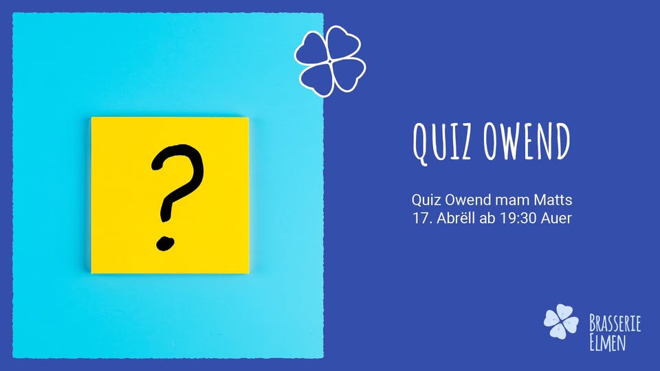 Participez à une soirée quiz animée par notre Quiz Master Matts à la Brasserie Elmen. Plusieurs catégories originales vous attendent pour tester vos connaissances. Un prix spécial récompensera les meilleures équipes. Profitez également d'un savoureux dîner dans une ambiance conviviale.