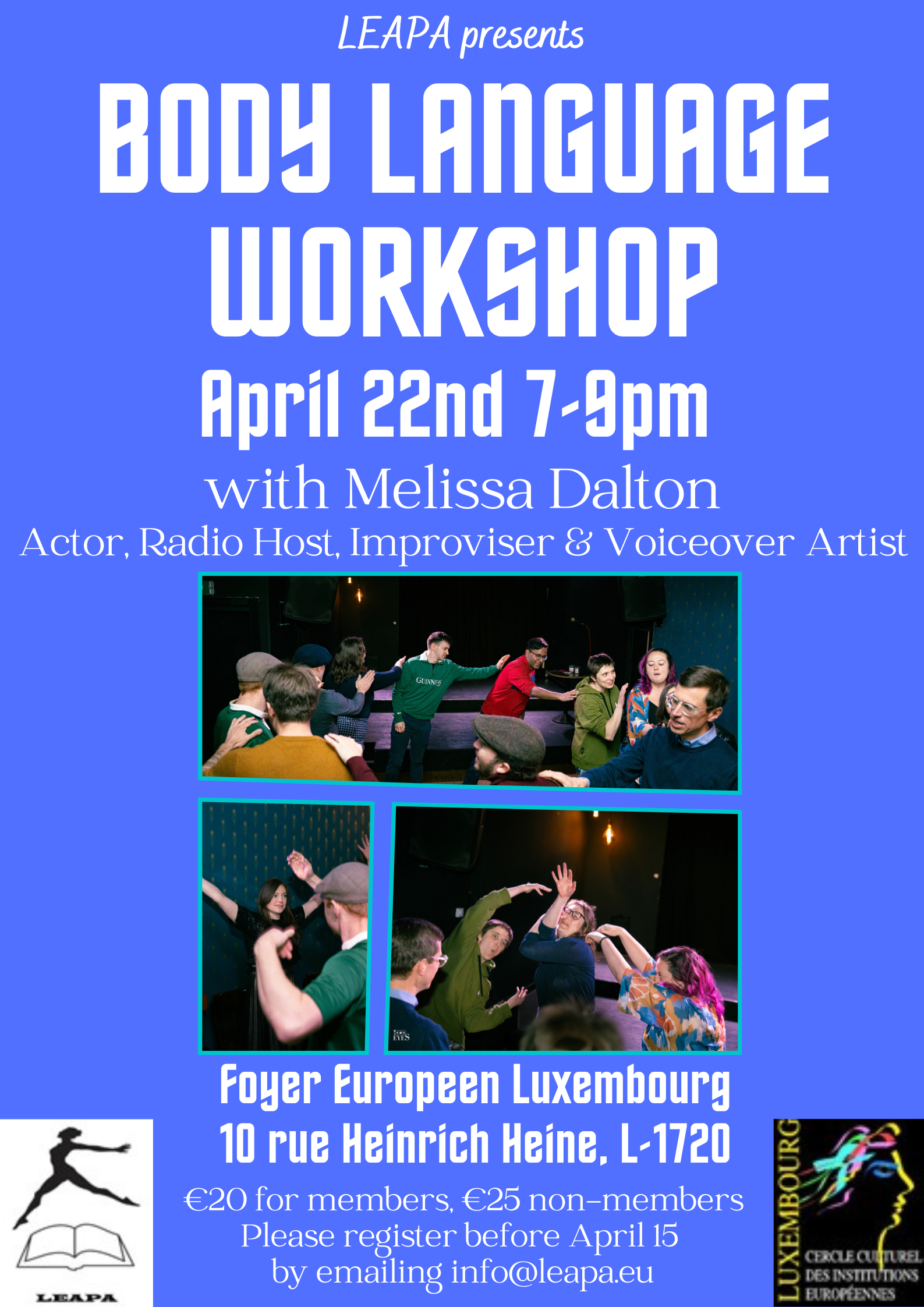 LEAPA présente cet atelier créatif et pratique qui explore le langage corporel à travers les outils du jeu d'acteur et du théâtre d'improvisation. Grâce à des exercices simples, des jeux et des mises en scène, les participants apprendront comment le corps communique intention, émotion et état, souvent avant même qu'un seul mot ne soit prononcé.
