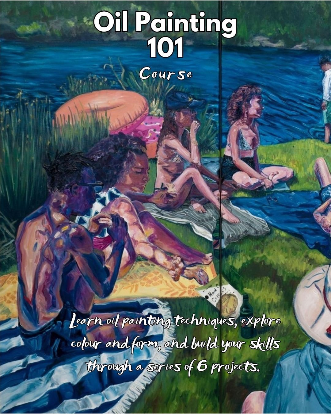 Peinture à l'huile d'Alvira Ferreira représentant des personnes se détendant au barrage de Silvermine, réinterprétant des scènes classiques de plein air avec des couleurs vibrantes.