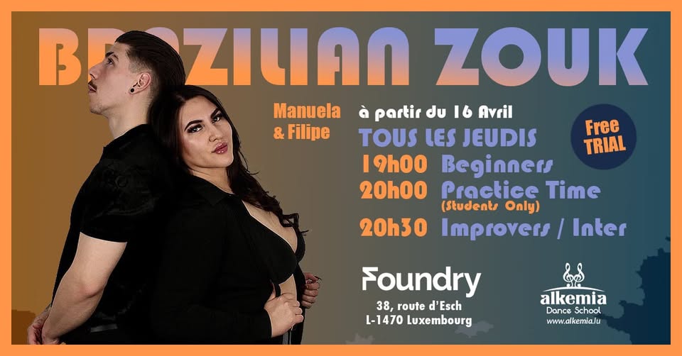 • 2026-04-16 18:00:00 2026-04-30 19:00:00 Europe/Paris Brazilian Zouk nouveaux cours débutants et intermédiaires/avancés/trimestre. Essai gratuit avec Manu Rejoignez nos nouveaux cours de danse Brazilian Zouk pour débutants et niveaux intermédiaires, proposés durant un trimestre jusqu'en juillet. Les cours auront lieu à The Foundry, 38 route d'Esch, Luxembourg. Les professeurs Manuela Ewert & Filipe, passionnés de Brazilian Zouk depuis de nombreuses années, vous accompagneront. Chaque cours est suivi d'une session de pratique libre réservée aux élèves inscrits. Cette danse est idéale pour améliorer la coordination corporelle et s'avère utile pour d'autres danses latines comme la Salsa, la Bachata ou même la Kizomba. Les cours commencent le jeudi 16 avril pour 12 semaines. Ouvert aux personnes seules ou en couple. Premier cours d’essai gratuit avant inscription au trimestre. Programme chaque jeudi : - 19h : grands débutants - 20h : pratique libre - 20h30 : niveau intermédiaire Planning complet pour d’autres danses disponible sur le site internet. Foundry Europe Alkemia Dance School