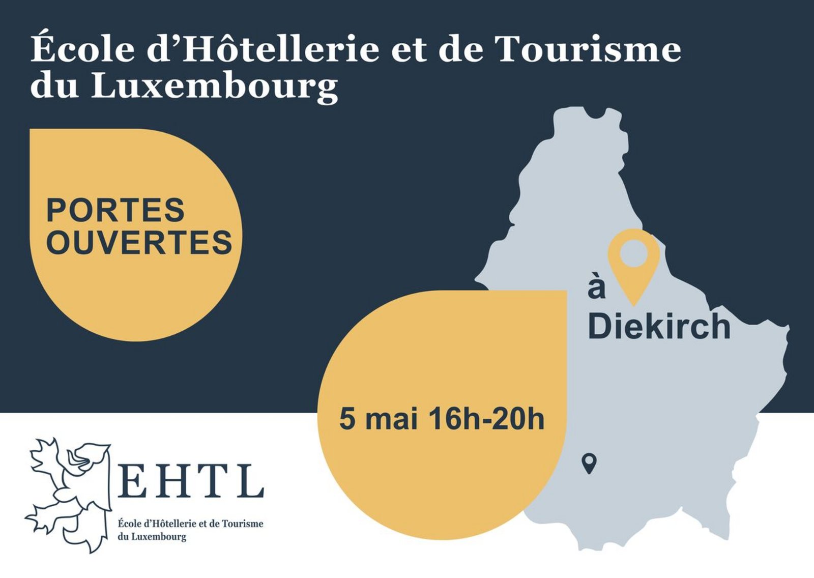 L’École d’Hôtellerie et de Tourisme du Luxembourg (EHTL) vous ouvre les portes de son Campus Diekirch pour un moment immersif dédié à la découverte de ses formations et de ses infrastructures. Cet événement est destiné aux futurs étudiants, à leurs parents et à toute personne intéressée par les métiers de l’hôtellerie, de la gastronomie et du tourisme, leur permettant de rencontrer les équipes pédagogiques, d’échanger avec les étudiants et de découvrir l’école.